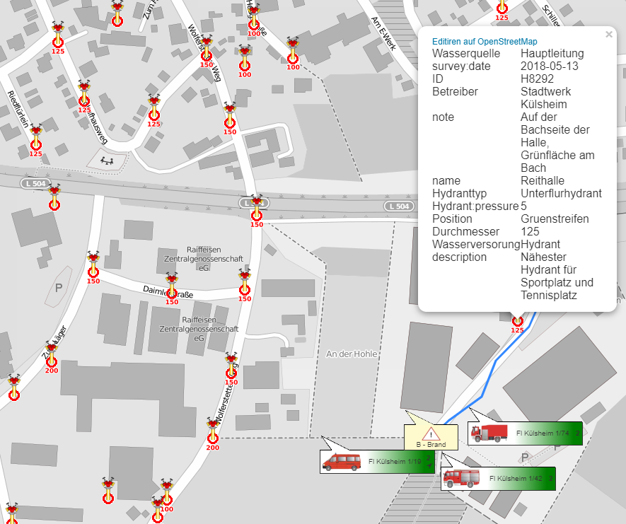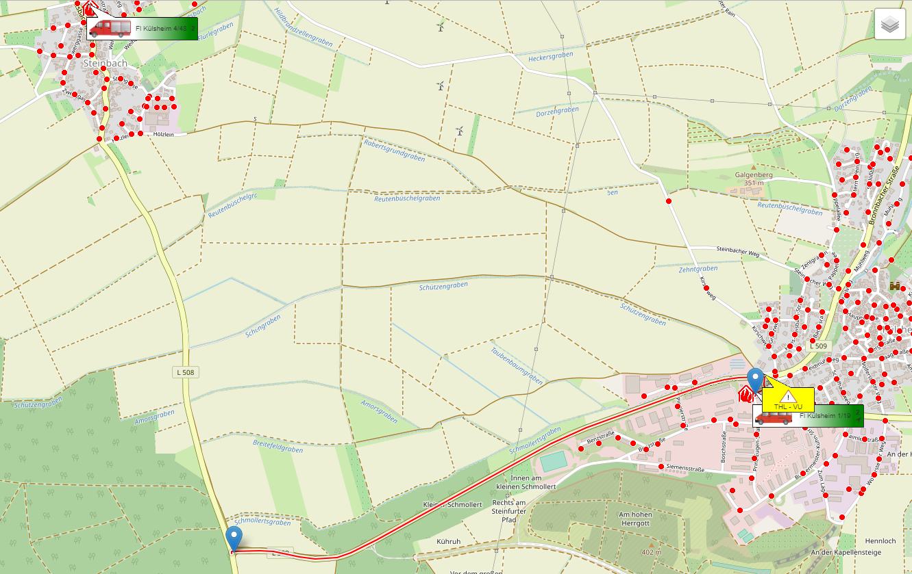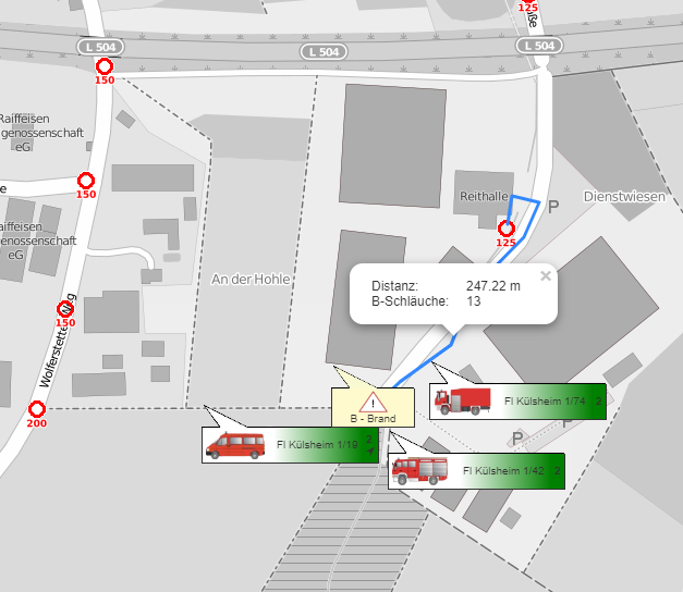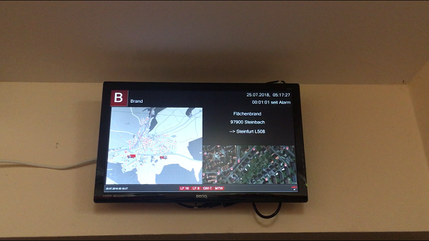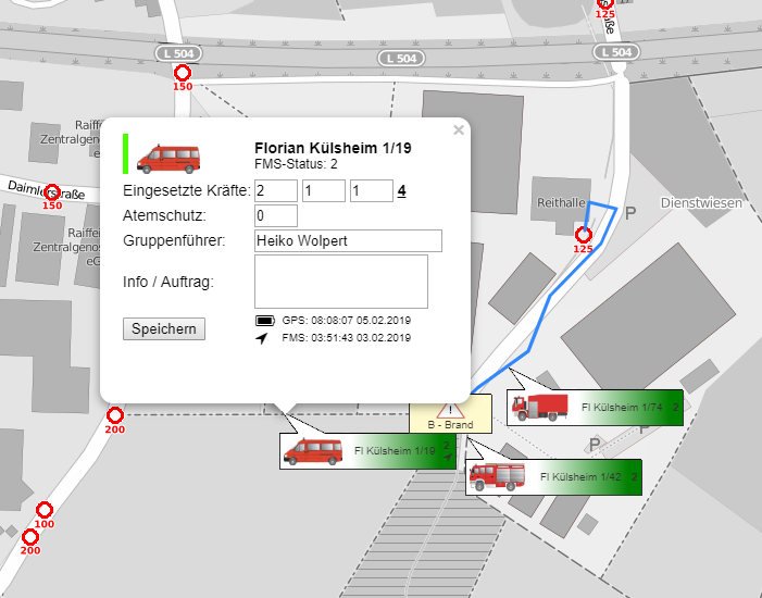 Aus den Einsatzdaten wir auch automatisch einen Einsatz auf der Lagekarte erzeugt, der Einsatzmonitor in der Umkleide und die Tablets in den Fahrzeugen schalten sich automatisch ein, die Tablets zeigen die Routen zum Einsatzort.