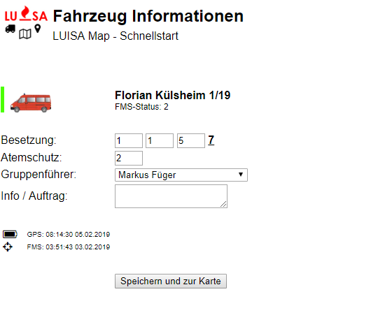 Bereits beim Einsteigen bzw. auf der Anfahrt kann sich der Fahrzeugführer die Gegebenheiten (Anfahrt, Umgebung, Hydranten/Wasserentnahmestellen) des Einsatzortes ansehen und der Fahrzeugführer kann auch die Daten wie die Besetzung des Fahrzeugs erfassen.